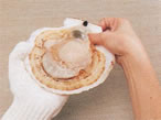 | ほたては夏が旬です!!『しかも刺身がサイコー』刺身は縦にきりましょう。ホタテの貝柱の筋肉繊維は縦。そのために縦に切った方が弾力があり、かみごたえがあります。グッとおいしさがアップしますよ。 |